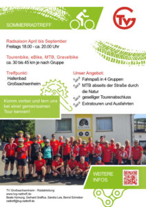 Am Freitag, dem 4. April um 18:00 Uhr startet der TVG/AOK-Radtreff (Kooperation mit der AOK) in die Sommersaison. Treffpunkt ist am Hallenbad Großsachsenheim. In drei unterschiedlichen Leistungsgruppen werden von 18:00 bis ca. 20:00 Uhr geführte Touren angeboten (Tourenrad, MTB, eBike und Gravelbike). Zur gleichen Zeit treffen sich Mountainbiker, die gerne auf Trails abseits der Straße unterwegs sind (Trailriders); Abfahrt ist ebenfalls um 18:00 Uhr am Hallenbad.